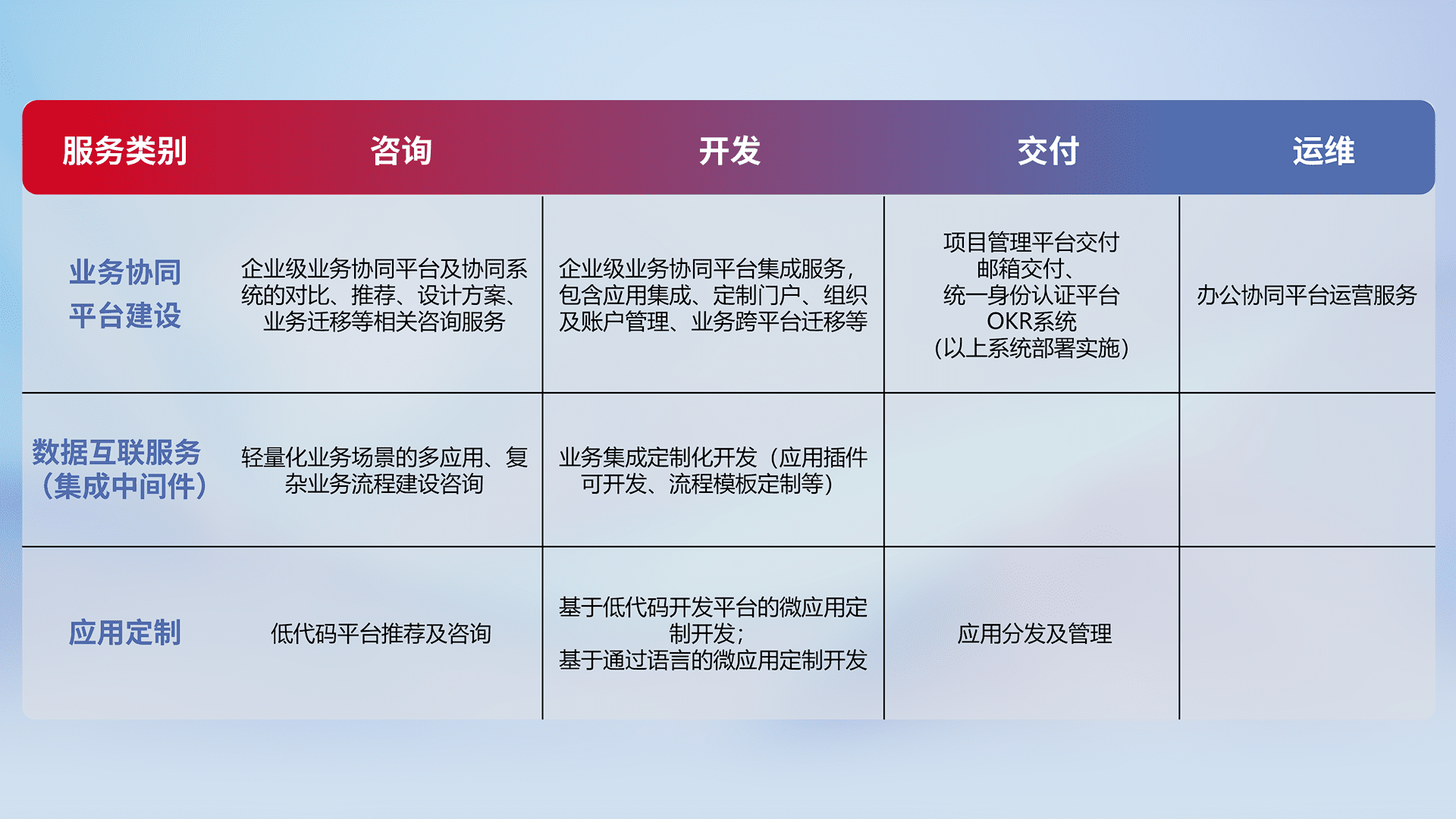 针对钉钉、、、企微、、IDaas等平台级产品提供产品的规划、、方案、、、交付、、定制化开发等服务,,,实现如统一协同办公、、、智能客户服务、、混合会议管理、、、智能数据查询、、、等业务场景,,,,实现数字化转型。。。